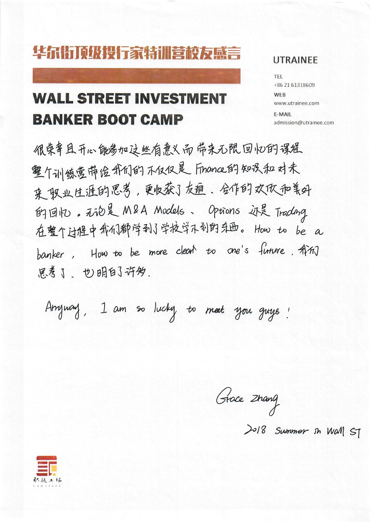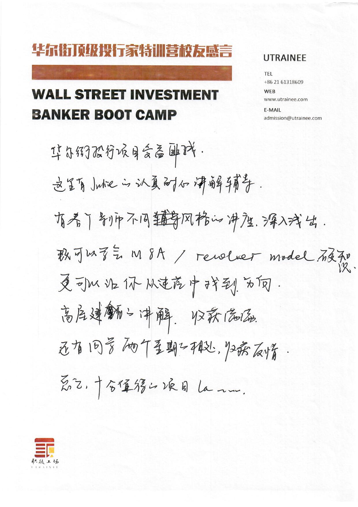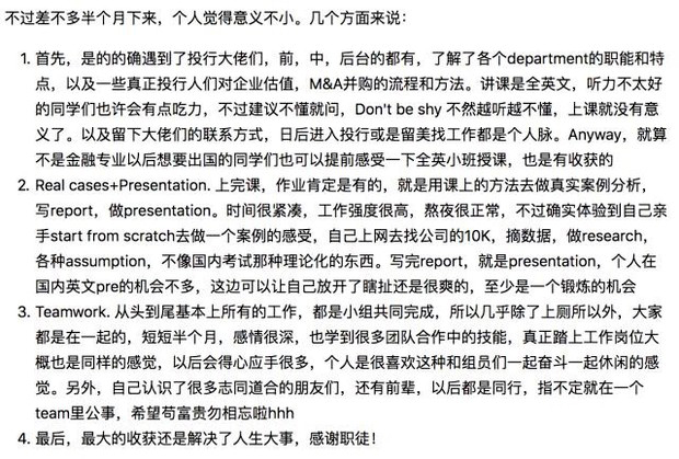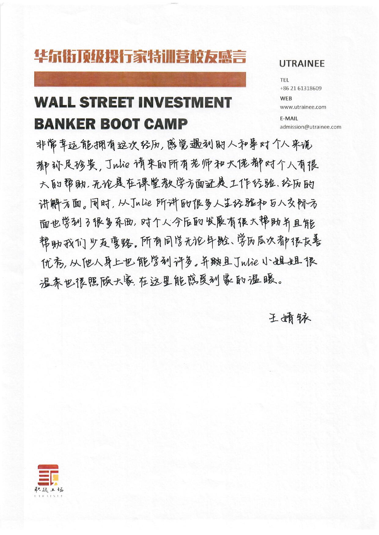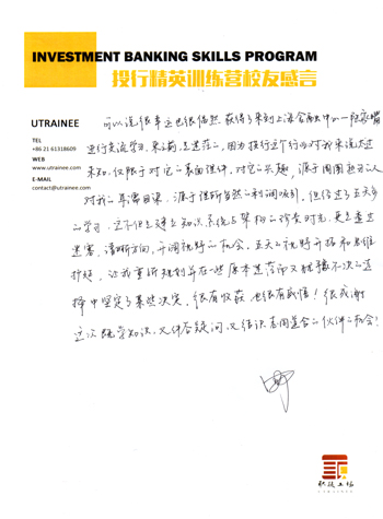 在美國,一封大牛的推薦信在求學求職路上扮演著非同一般的作用,即使在國內,投行招募人才的第一標準也為是否具備相關的實習或培訓經歷,否則,GPA再高、證書再多,用人單位也會置后考慮。本次投行訓練營頒發(fā)項目證書及國際投行導師親自簽署的個人推薦信,里面將詳細講述習得的知識點,這將成為學子今后求職路上富有說服力的憑證。
